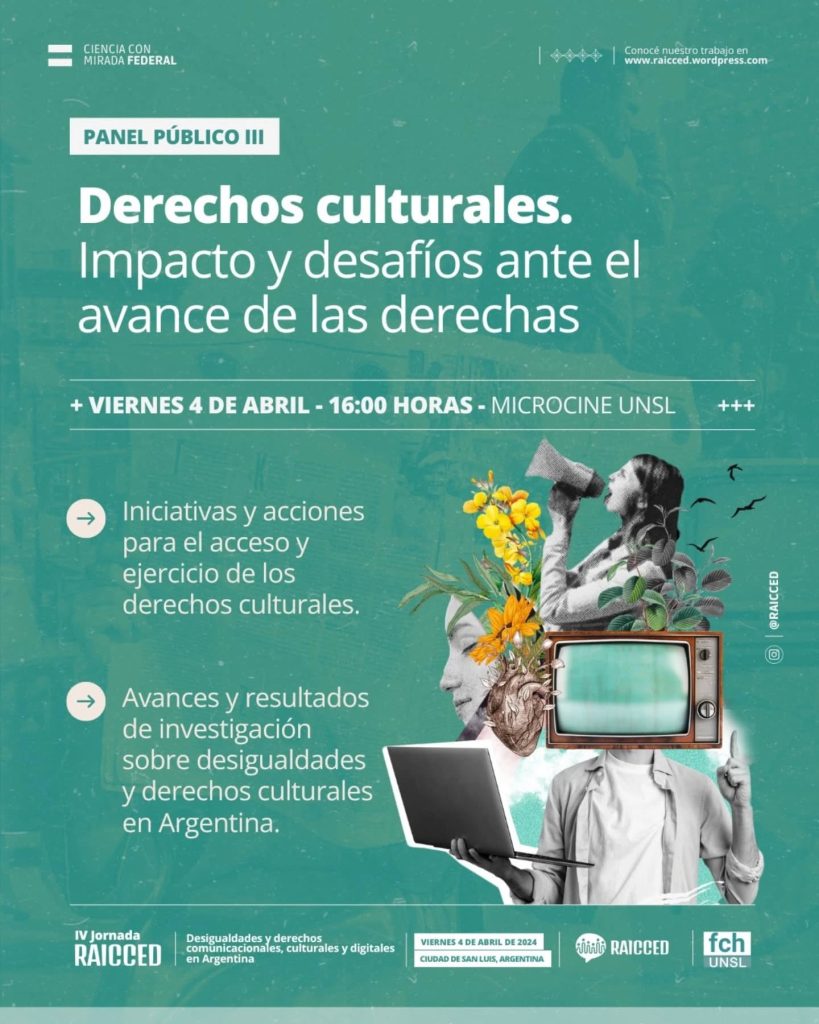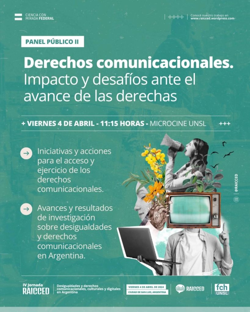 La Facultad de Ciencias Humanas de la Universidad Nacional de San Luis (UNSL) será sede de la IV Jornadas de la Red Argentina de Investigadoras e Investigadores en Comunicación y Cultura con Enfoque de Derechos (RAICCED).