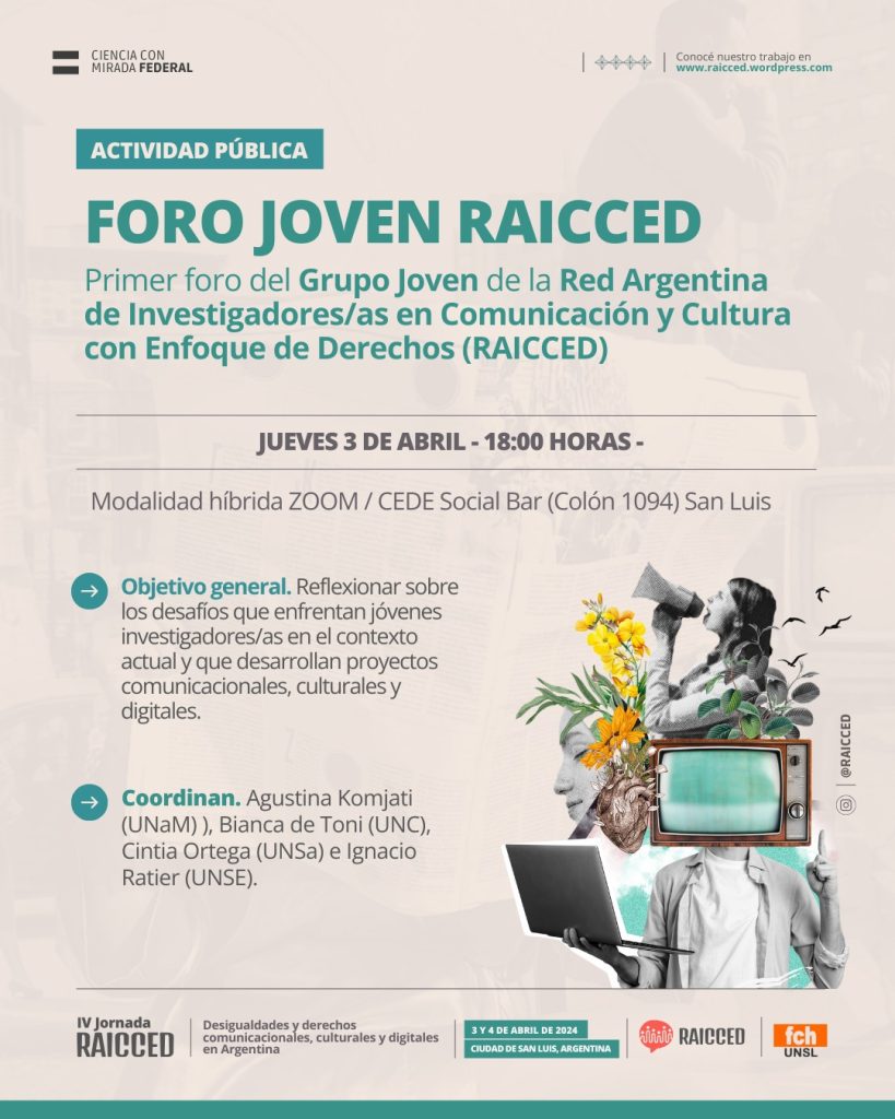 En la ciudad de San Luis se realizará el I Foro Joven RAICCED y la IV Jornada RAICCED que se desarrollará en la Facultad de Ciencias Humanas (FCH) de la Universidad Nacional de San Luis (UNSL).